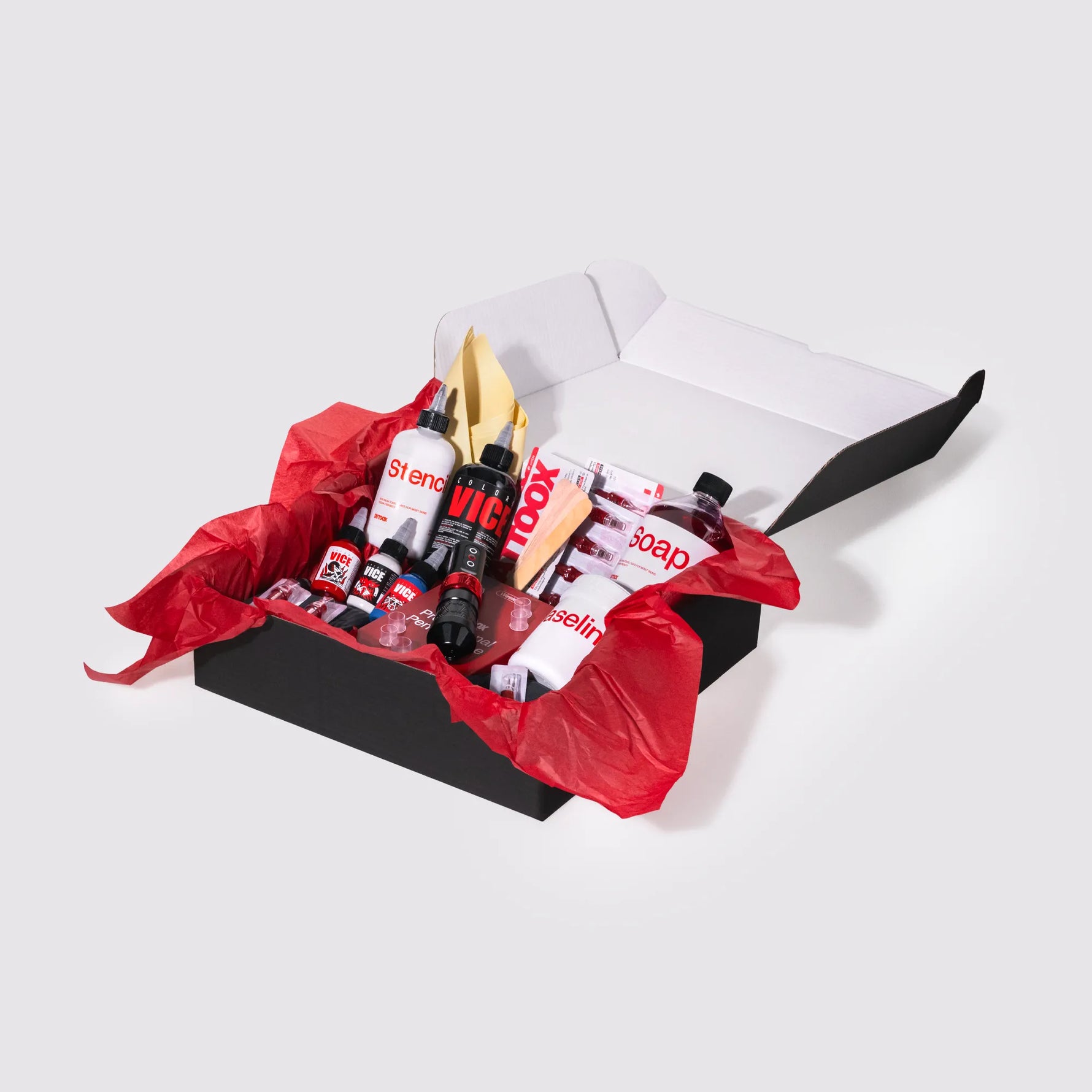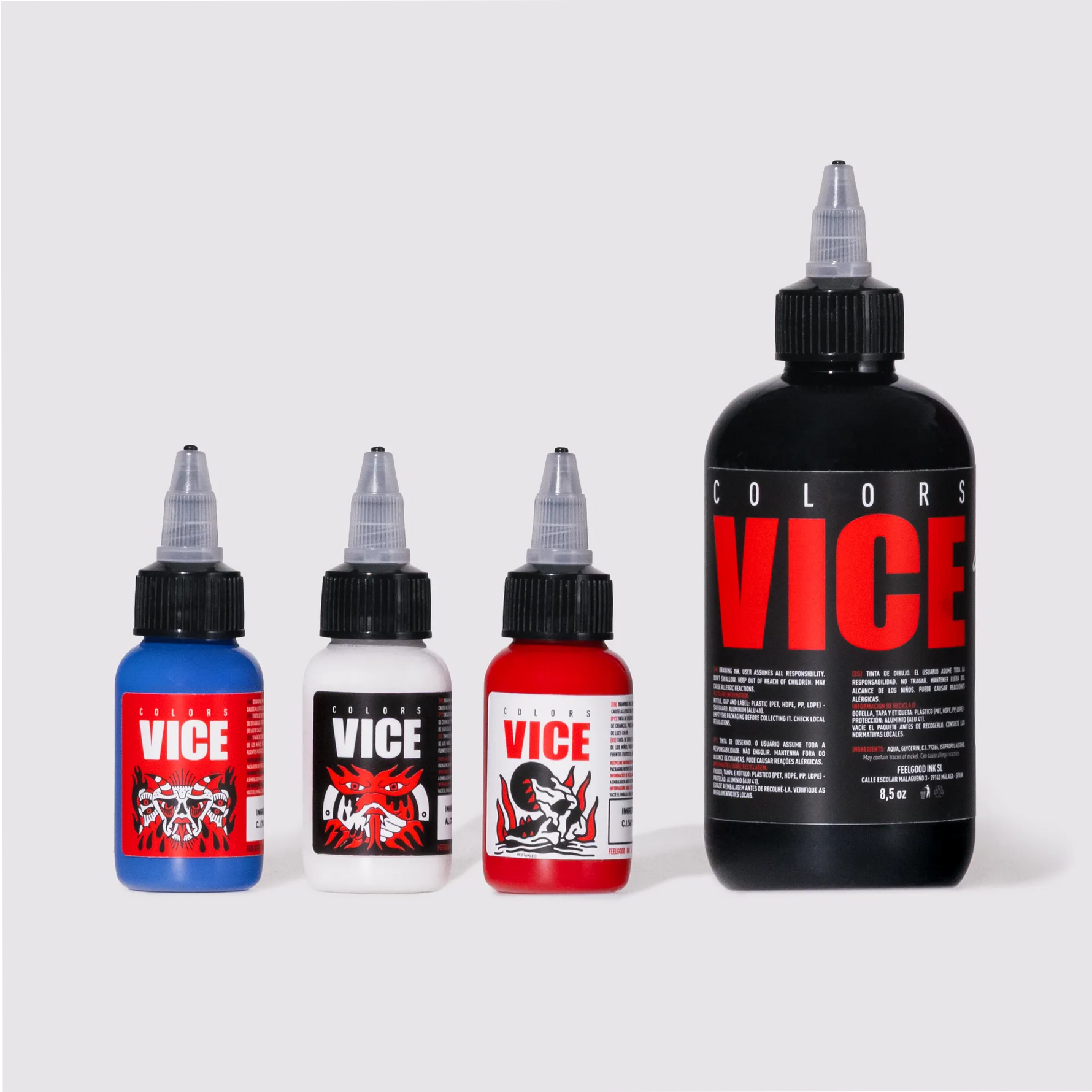• Tintas Vice Colors: Incluye Tinta Negra 250ml, Tinta Blanca 60ml, y ahora también Tinta Azul 60ml y Tinta Roja 60ml, ideales para trabajos coloridos y variados.